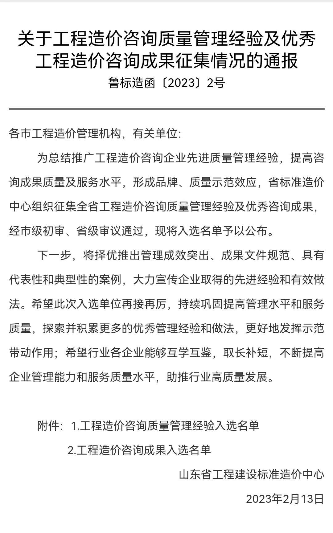 ?為總結(jié)推廣工程造價(jià)咨詢企業(yè)先進(jìn)質(zhì)量管理經(jīng)驗(yàn),提高咨詢成果質(zhì)量及服務(wù)水平,形成品牌、質(zhì)量示范效應(yīng),省標(biāo)準(zhǔn)造價(jià)中心組織征集全省工程造價(jià)咨詢質(zhì)量管理經(jīng)驗(yàn)及優(yōu)秀咨詢成果,經(jīng)市級(jí)初審、省級(jí)審議通過(guò),我公司入選山東省工程建設(shè)標(biāo)準(zhǔn)造價(jià)中心“工程造價(jià)咨詢成果”名單。