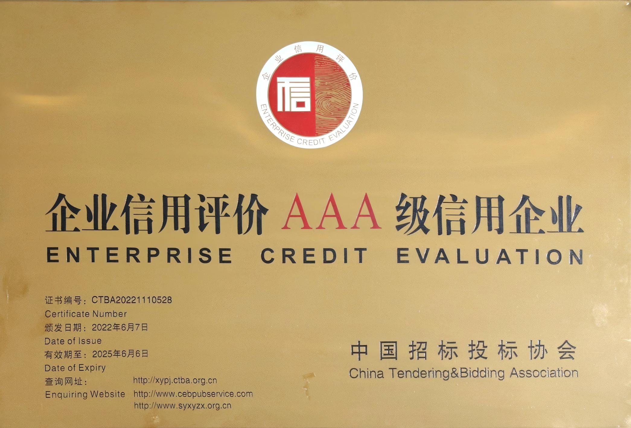 • 中國(guó)招標(biāo)投標(biāo)協(xié)會(huì)企業(yè)信用評(píng)價(jià)AAA級(jí)信用企業(yè)